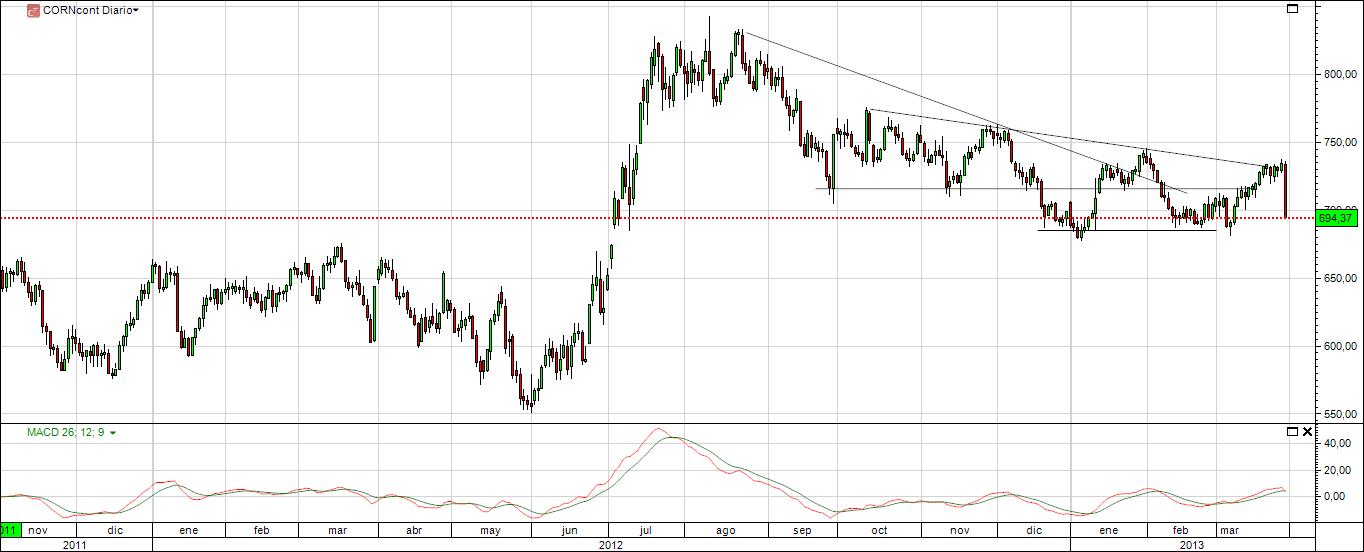 Ahora los precios están canalizados en un rango lateral que le está dando cierto respiro a la bajada. Lo difícil es determinar desde esta situación que dirección definitiva tomará. De ser al alza, nos toparemos con la fuerte resistencia que se formó en los 680 centavos, aprovechando dicho impulso para rellenar el hueco en los precios originado en los días de las fuertes caidas. Y de ser a la baja, los precios se trasladarían a la zona de los 600 centavos/bushel. No se trata de adivinar el futuro y pronosticar el siguiente movimiento, ahora permaneceremos a la espera y dejaremos que el precio nos marque el rumbo a seguir, luego tan solo nos limitaremos a seguirle.