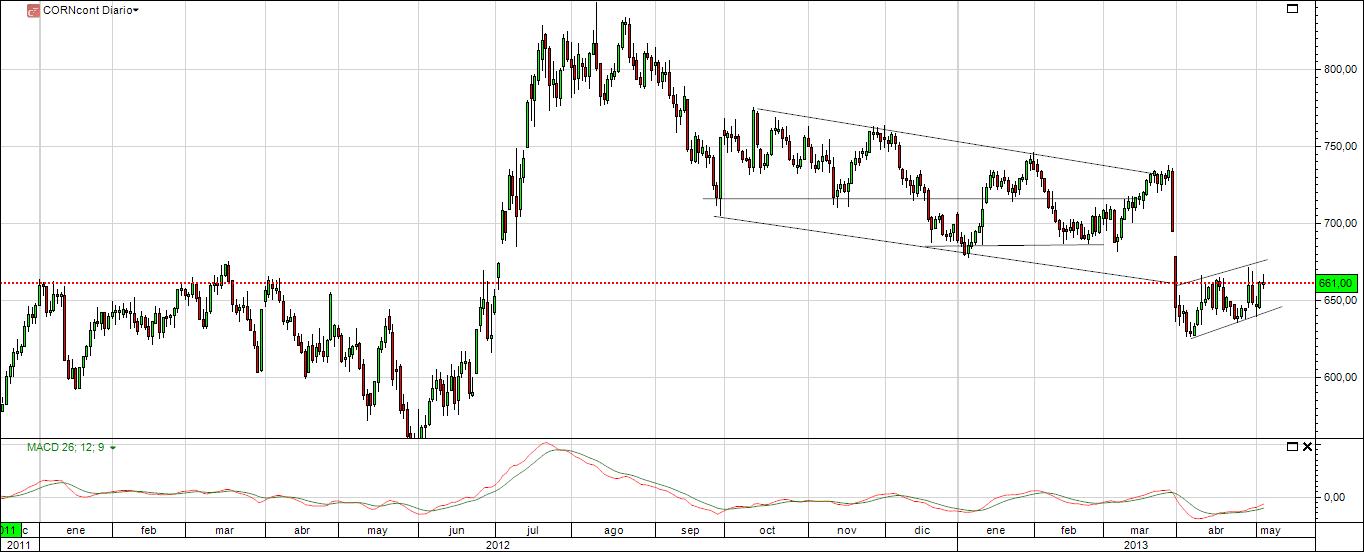Aqui les traigo el gráfico del maiz en representación diaria. Para los que todavía no conocen los beneficios que aporta el análisis técnico chartista en este claro ejemplo podemos comprobar como los precios de los activos no siempre se mueven de manera aleatoria, sino que se encuetran encasillados atendiendo a unas circunstancias y niveles claves que les someten y de alguna manera genera en ellos un orden dentro del caos.