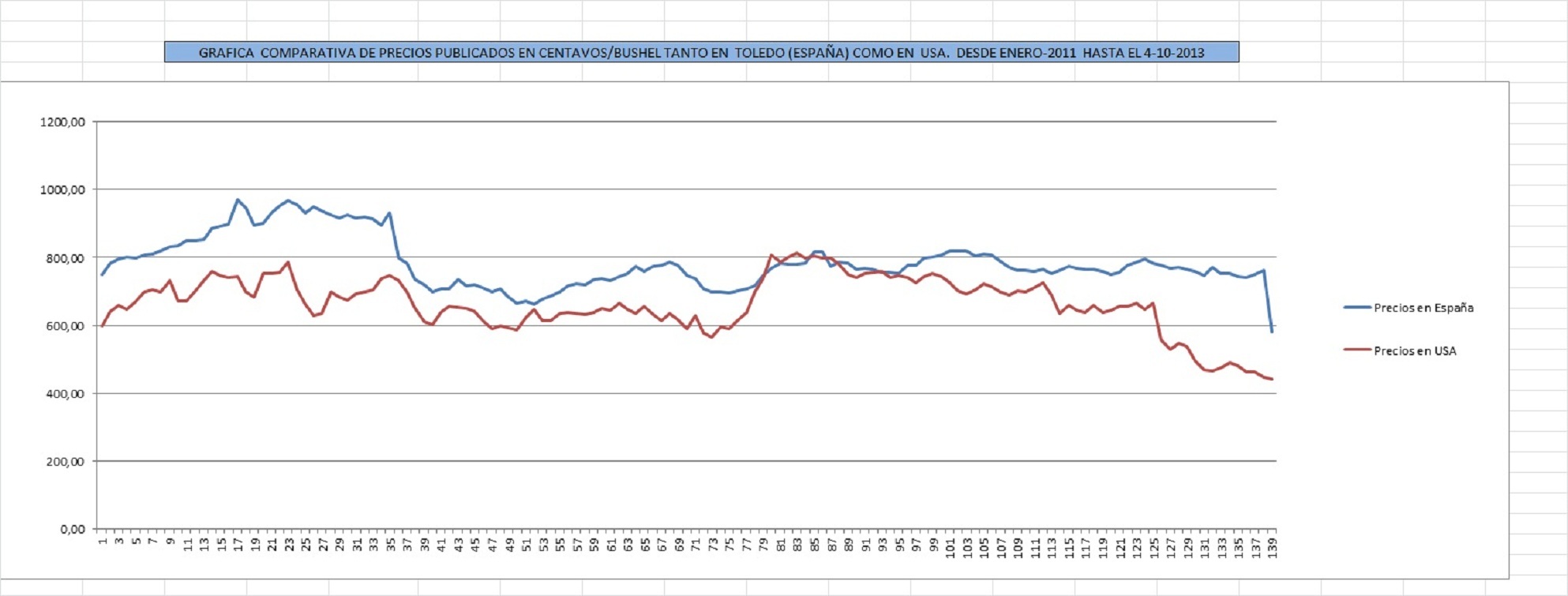 Para solventar el problema de la valoración en dos monedas distintas euros y dólares, hemos convertido las cotizaciones en euros por tonelada métrica, en centavos de dólar por bushel, (un bushel equivale a 25,4 kg. de maiz y es lo que denominamos fanega en nuestro pais. Además se ha tenido en cuenta el tipo de cambio euro-dólar cotizado en cada fecha de publicación para que el valor resultante nos proporcione una cifra real de mercado.desestimando en todo caso la paridad euro-dólar de 1 a 1. Una vez convertidos los datos en centavos/bushels y representados de manera gráfica podemos obtener una visión muy objetiva y esclarecedora de la asombrosa relación de los precios cotizados tanto de un lado como del otro del Atlántico.