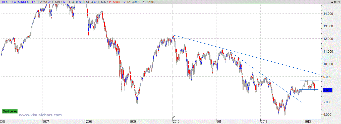 Si por el contrario perdieramos el apoyo de los 9700 puntos, nos precipitariamos irremediablemente hasta los 9250 en donde encontrariamos el primer sustento.