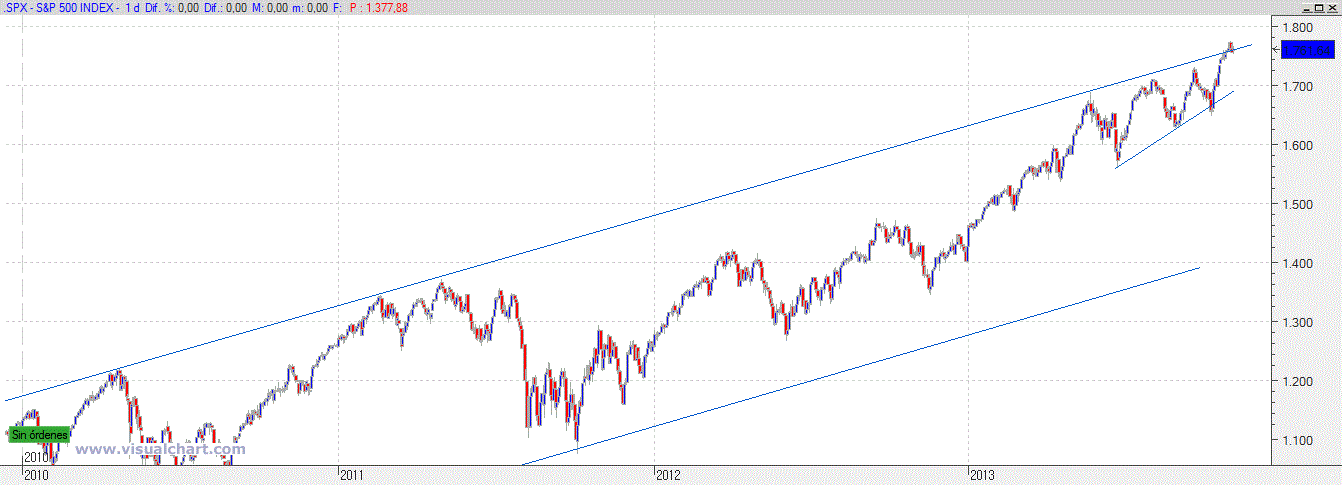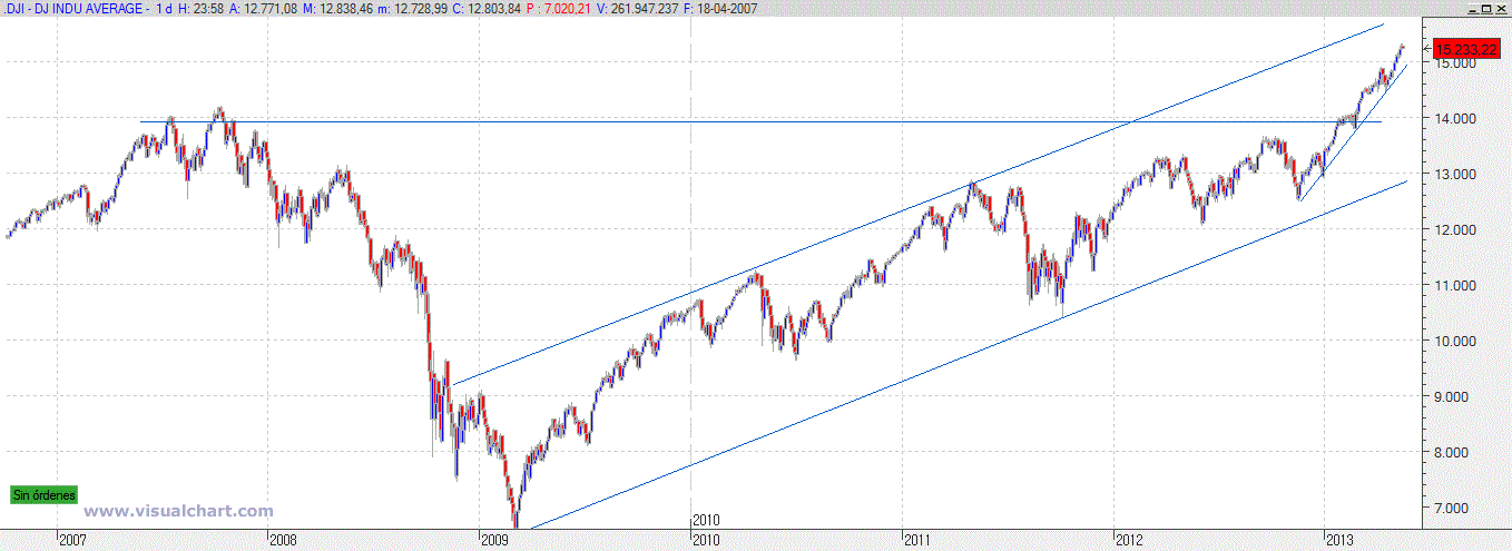 Este hecho ya nos proporciona el primer aviso de que algo no funciona del todo bién. Esta divergencia de índices representa una contradiccion si intentamos defender la idea de que la tendencia sigue siendo fuertemente alcista. El que uno de los dos índices tenga dificultades para batir nuevos records denota cierta debilidad y crea dudas respecto a la fortaleza de la subida. A estos motivos que les hemos descrito, podemos sumar la larga trayectoria alcista desarrollada por el índice, subida que pensamos que debería llegar a su fín. Como colofón a este espectaculo y que puede ser el detonante de una brusca caida, está la previsible retirada de las inyecciones de liquidez por parte de la Fed.