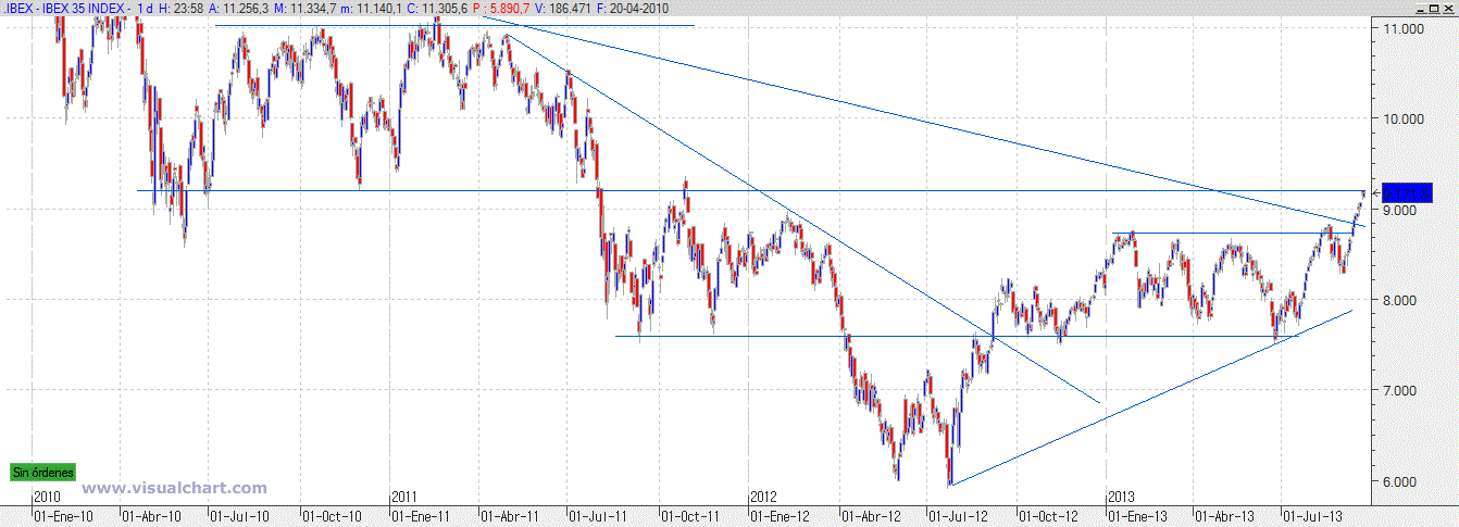 Continuamos nuestra escalada alcista rompiendo resistencias importantes que nos hacen preveer que la fiesta durará todavía algún tiempo. Efectivamente nuestro selectivo español parece haber dejado atras la nada despreciable resistencia situada en torno a los 8800 puntos. La superación de este nivel supone un alivio en cuanto que damos por vencidos a los bajistas y comienza a entrar dinero fresco en nuestra economía. La resistencia de los 8800 puntos viene dada por la formación de un techo de mercado durante todo este año 2013, además de encontrarse justamente ahí el corte de la linea de tendencia bajista de más largo plazo. De ahí la importancia de dicha cota y de mantenernos a flote por encima de ella.